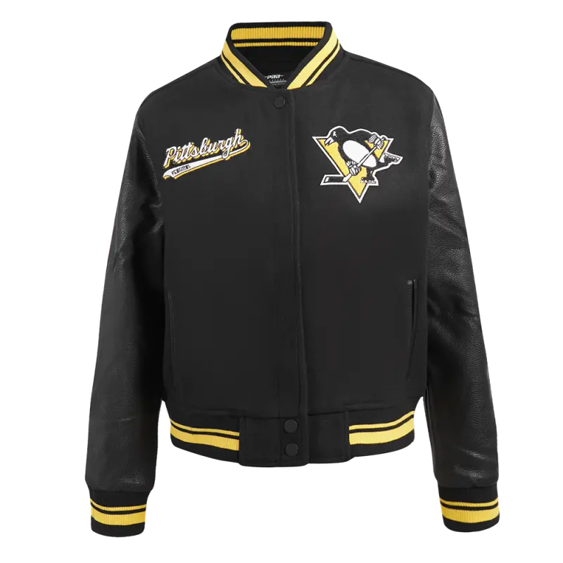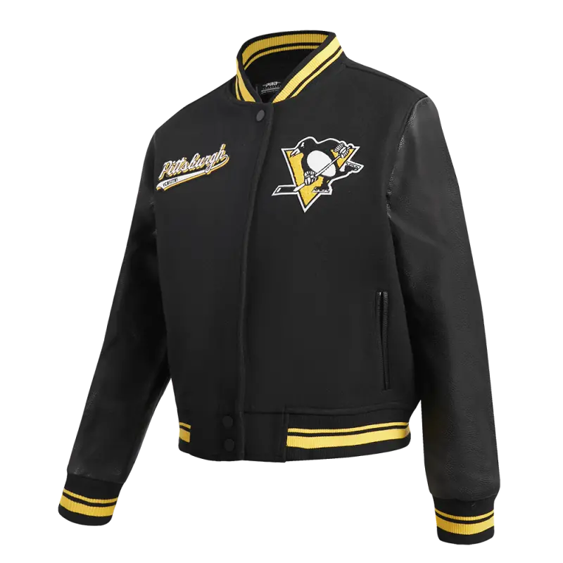 NHL PITTSBURGH PENGUINS SCRIPT TAIL WOMEN’S WOOL VARSITY JACKET (BLACK\/YELLOW)