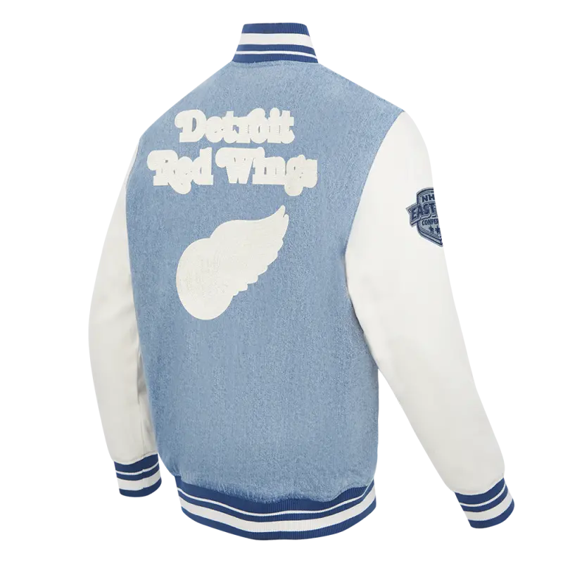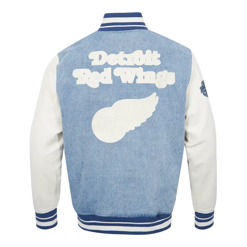 NHL DETROIT RED WINGS VARSITY BLUES MEN’S DENIM VARSITY JACKET (DENIM\/LINEN)