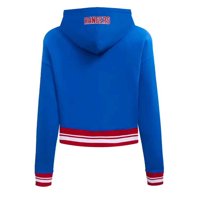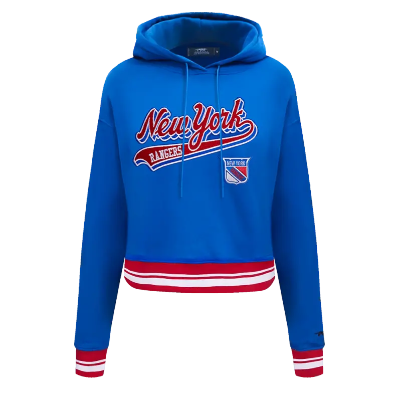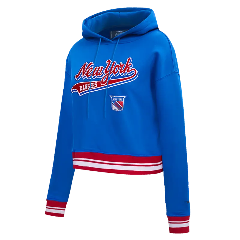 NHL NEW YORK RANGERS SCRIPT TAIL WOMEN’S RIB FLEECE CROPPED PULLOVER HOODIE (ROYAL BLUE\/RED)